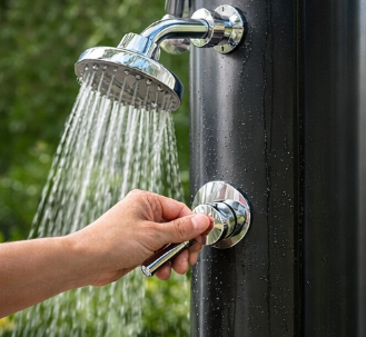 는 LY18L01 is equipped with a large rain shower head that provides a refreshing shower experience with a wide spray. The shower head is adjustable up to 180° via its integrated ball joint, allowing users to customize the direction of the water flow. Whether you prefer a direct, focused stream or a gentler, more dispersed spray, the adjustable rain shower head delivers a satisfying and personalized experience. The large shower head adds to the luxurious feeling of the LY18L01, making it perfect for those who want to feel like they are under a gentle rainfall while enjoying a soothing outdoor shower. This feature enhances the overall shower experience, making it a desirable choice for homeowners and businesses alike.