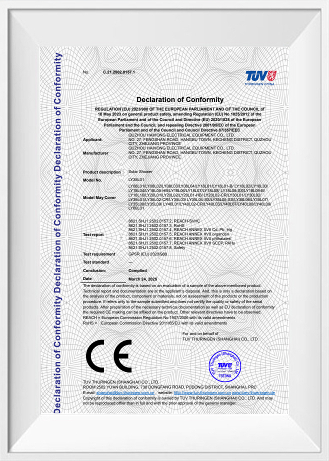 고급 야외 샤워 시스템 설계에 있어 소재 선택은 제품 수명과 사용자 만족도를 직접적으로 결정합니다. Quzhou Haihong 전기 설비 유한 회사 는 태양광 샤워 산업에서 15년 이상의 전문 R&D 전문 지식을 보유하고 있으며 야외 환경에서 재료에 대한 엄격한 요구 사항을 깊이 이해하고 있습니다. 우리는 태양열 샤워 WPC 보드 (목재-플라스틱 복합재)를 샤워 시스템에 추가하여 전통적인 목재가 썩는 경향과 화상을 일으킬 수 있는 금속 표면의 높은 열 전도성과 같은 업계의 일반적인 문제점을 특별히 해결했습니다.